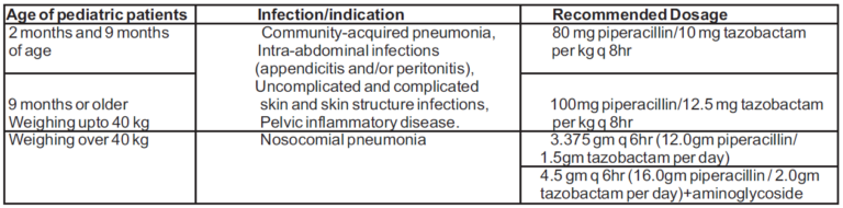 TAZSUP 4.5 can be administered in pediatric patients from 2 months of age. The dosage and the indications in pediatric patients with normal renal function are as follows: